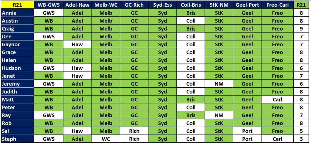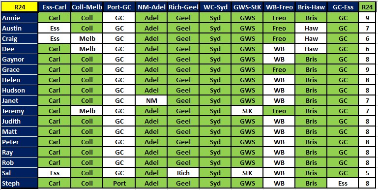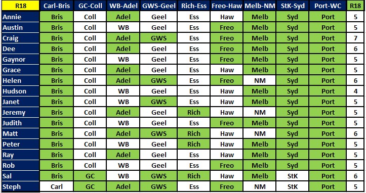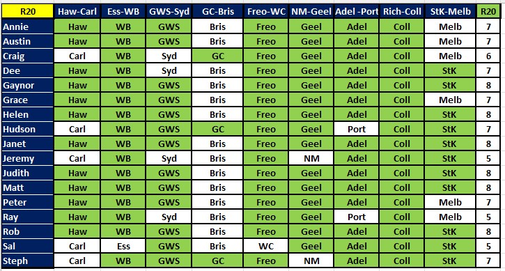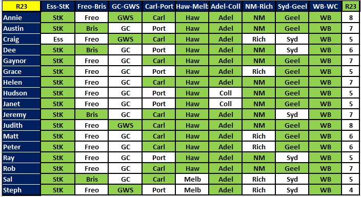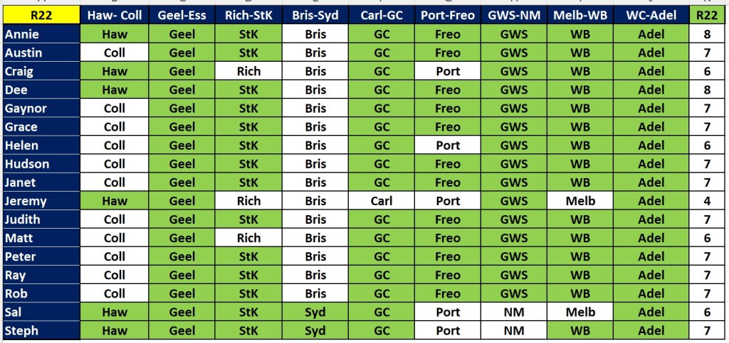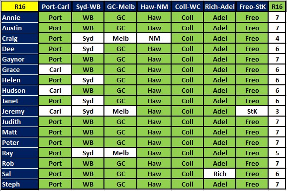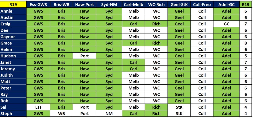 A bunch of people got all 7 this week – Annie, Ausi, Gaynor, Judith, Matt, Peter, Rob and Steph. Next best with 6 were Dee, Grace, Helen, Huddo, Janet and Sal. But there is no change at the top of the ladder, with Rob still leading by 2. We have 8 rounds left to tip on, and the byes are now over, so we are back to 9 games each round.