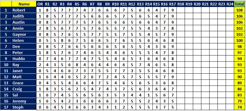 Quite a few people got all 9 this week: Ausi, Dee, Gaynor, Judith, Matt and Rob, followed by Annie, Grace, Helen, Huddo, Janet, Peter and Ray with 8. The leaders all got 9 so there is no change at the top of the ladder, with Rob holding on to his lead of 2.