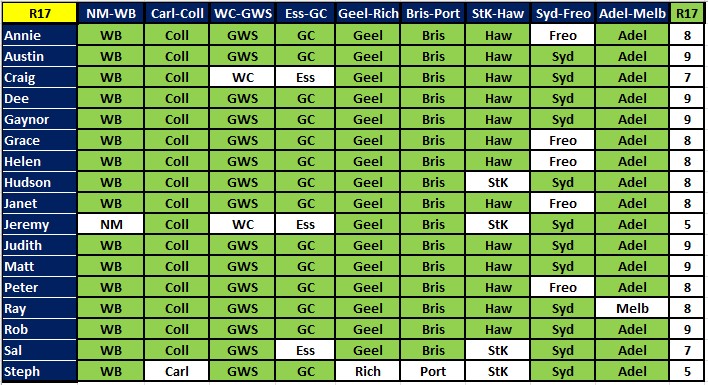 Reporting in from Boston this morning (Sunday morning here) and today a bunch of us are going to the Fenway to see the Red Sox play the Houston Astros. Maybe I should travel to the US more often because I got all 9 this week, followed by Annie, Ausi, Grace, Helen, Judith, Matt, Peter and Rob all with 8. Meanwhile, Rob holds on to his lead of 2, with 3 weeks of tipping left.
