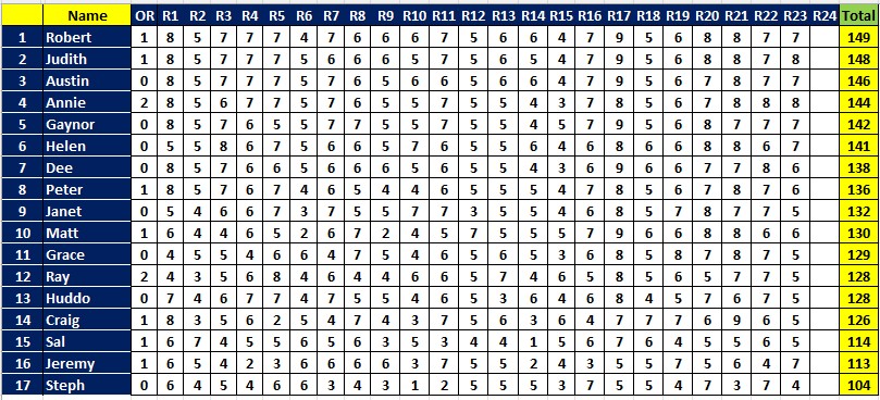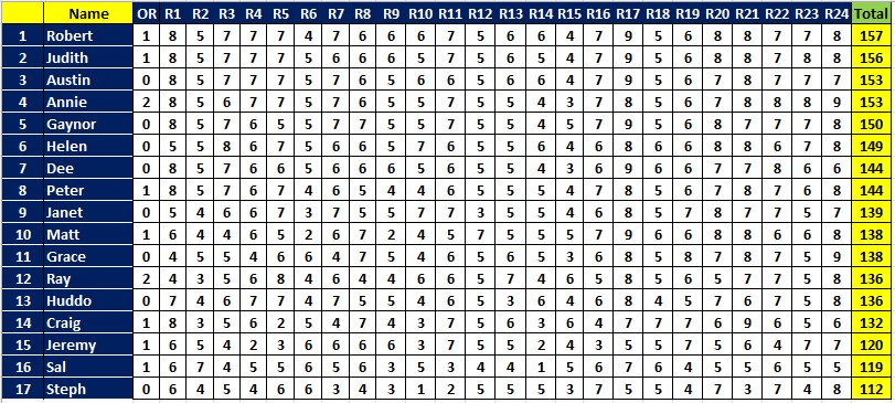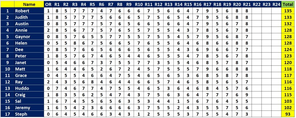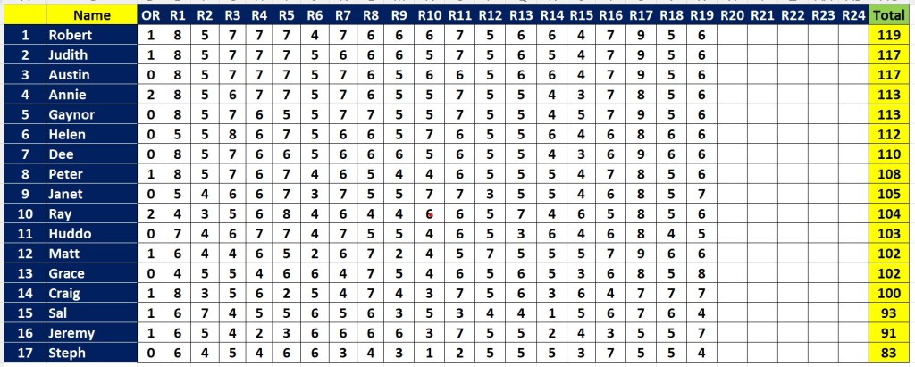 This week, leading the way with 8 were Annie and Dee. Next best with 7 were Ausi, Gaynor, Grace, Huddo, Janet, Judith, Peter, Ray, Rob and Steph.