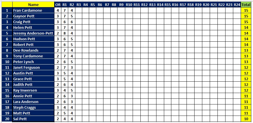 This week, our best tipsters were Gaynor, Helen, Janet, Judith, Matt and Rob all with 8 out of 9. Next best with 7 were Annie, Ausi, Dee, Grace, Huddo, Peter and Steph. Rob still leads by two with four rounds to go.