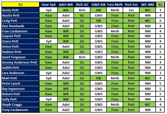For Round 22 starting Thursday 7 August, I am in the US for the whole round. You can send your tips to me by text but I won’t send a text reply because my phone plan charges me for sending international texts. Or you can send tips to me by Whatsapp via my same mobile number. Or you can send tips to me by email but my replies on email might be late. Also, I won’t be able to send reminders to people to get tips in. And posting of results might be late.