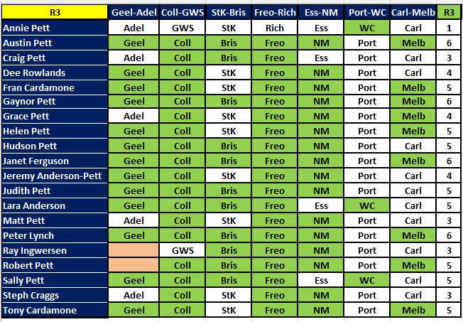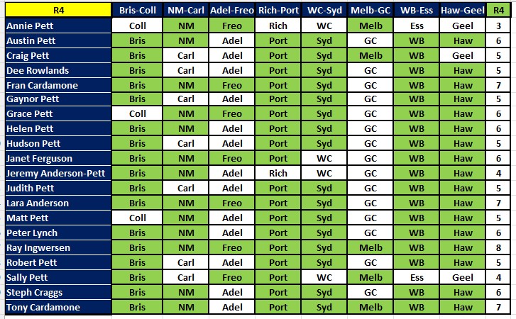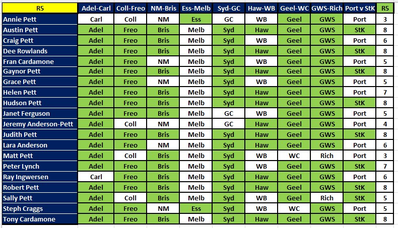 Great tipping this week by Ausi, Dee, Gaynor, Huddo, Judith, Rob and Tony, who all tipped exactly the same and got 8, missing only Essendon. Next best with 7 were Helen and Peter. Meanwhile, Gaynor has jumped back into the lead on her own, one ahead of Tony and two ahead of a bunch of people tied on third.