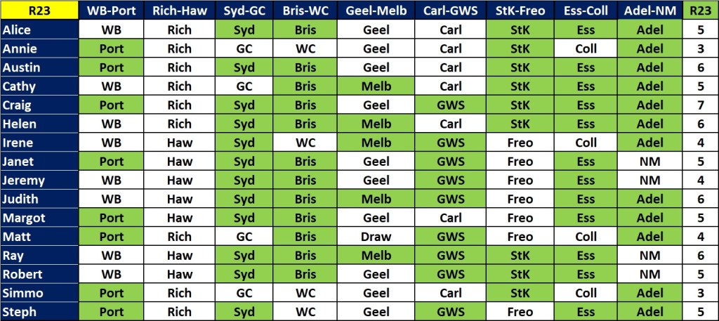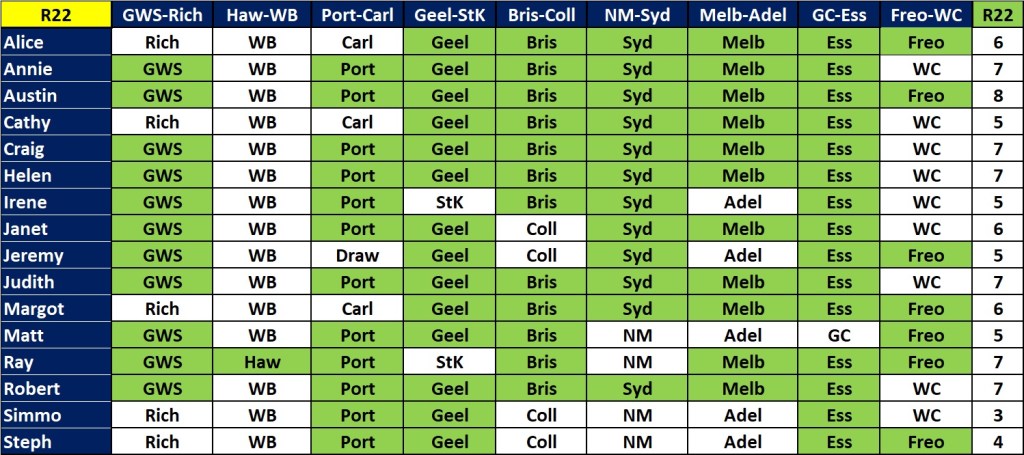 Austin led the way this week with 8. Well done Ausie. The only one he missed was Hawthorn over the Bulldogs – in what was, if the Tasmanian Premier sticks to his guns, the last AFL game to be played in Tasmania until the state gets a side of its own. A few people got 7: Annie, Helen, Judith, Ray, Robert and and me.