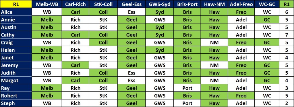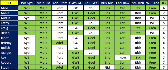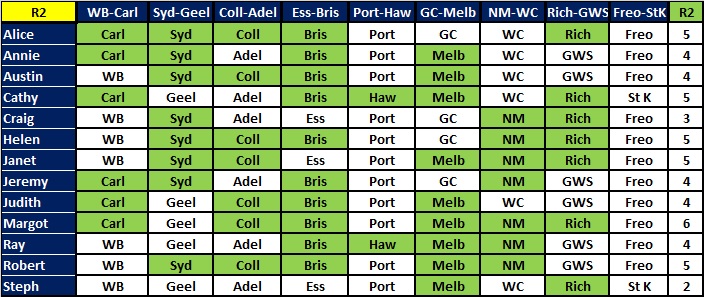 Leading the way this week were Ray and Jeremy with 8. Ray missed Freo. Jeremy was sure he was going to get all 9 after the first 8 games had been played, but Geelong let him down against Hawthorn today. It isn’t easy to get all 9 and it doesn’t happen very often! Meanwhile, Cathy got 7 and is now in the lead on her own, 1 ahead of Robert and Alice. (To see the Ladder, go to the ‘Ladder’ page).
