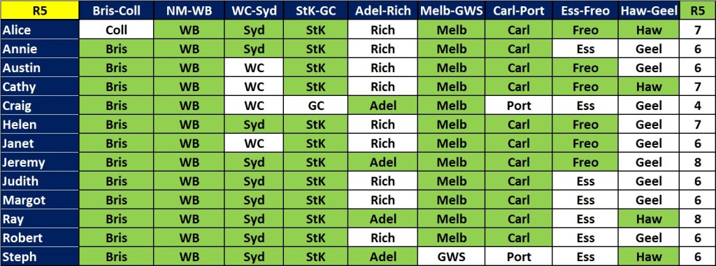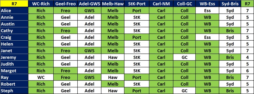 In the tipping, leading the way with 7 were Annie, Ray, Robert, Steph and me. There’s now a 3-way tie for the lead between Cathy, Alice and Robert (see the ‘Ladder’ tab).