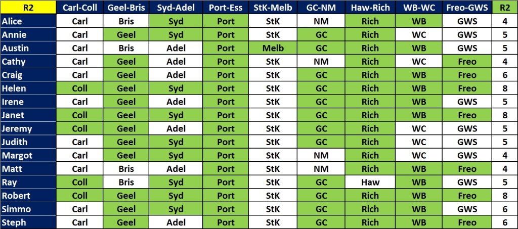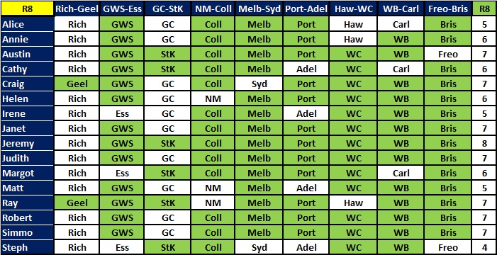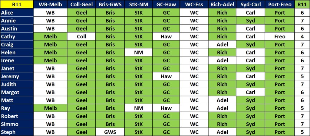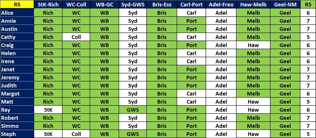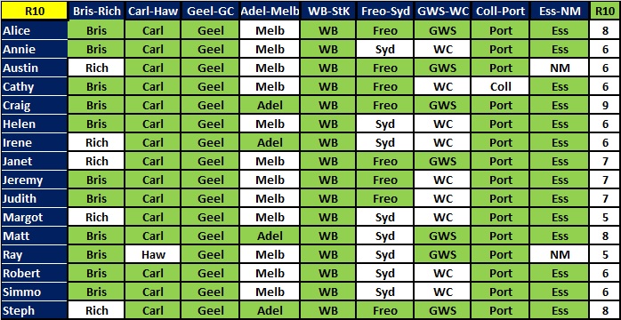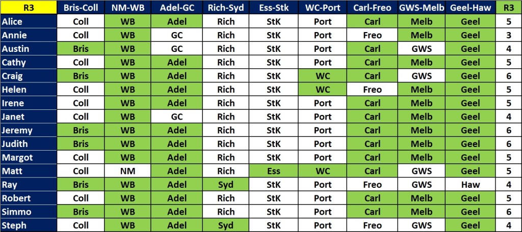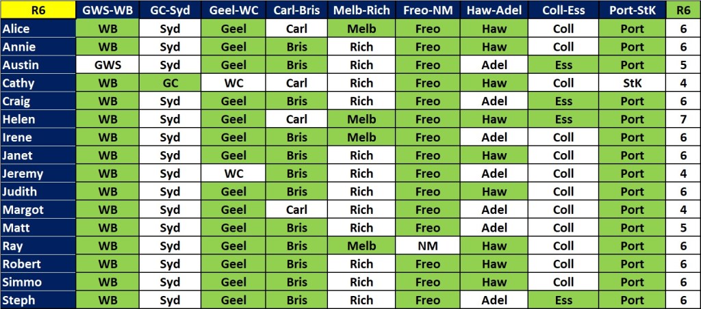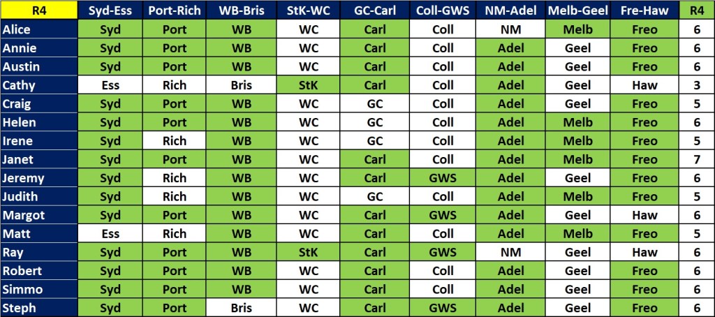Helen leads the way with 7 this week and that gets her back into the joint lead with Robert and Simmo, with Janet 1 back. Cathy was the only person to get Gold Coast over Sydney.