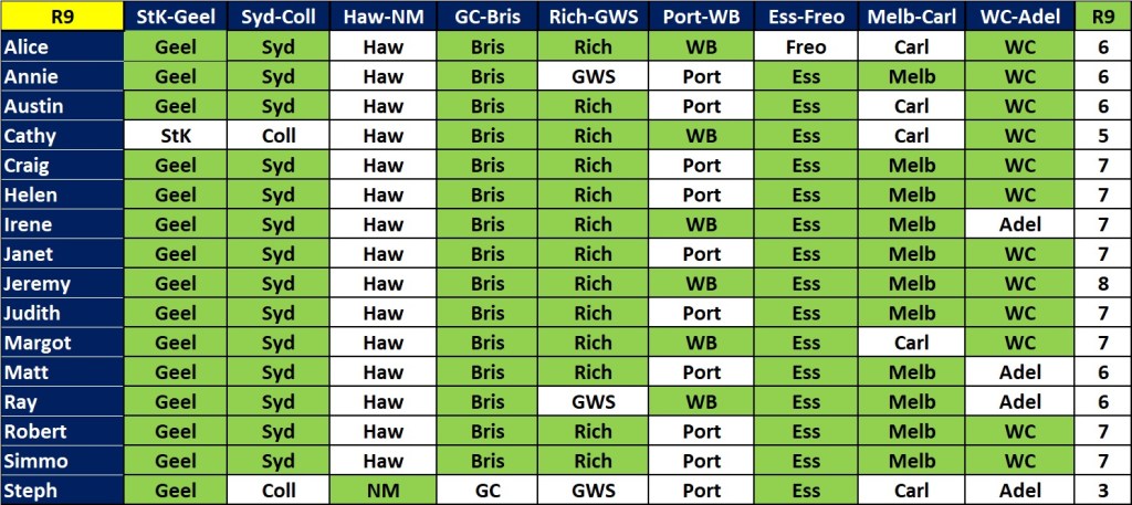 I got all 9 this week. For anyone who might have noticed, when I put the tips up here on the blog on Friday night, I had my tip as Collingwood for the Collingwood-Port game, but that was a mistake. I spotted it Saturday night and fixed it and updated it here on the blog that night (before that game). So anyway, I got all 9. Three people got 8 – Alice, Matt and Steph.
