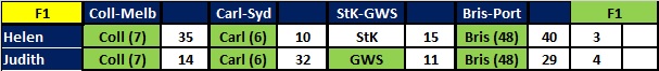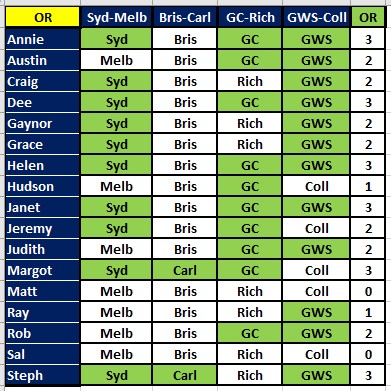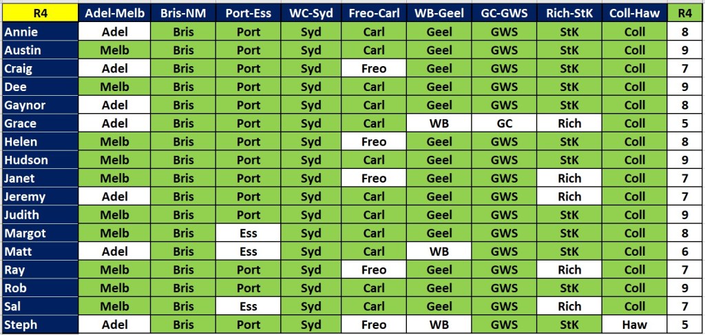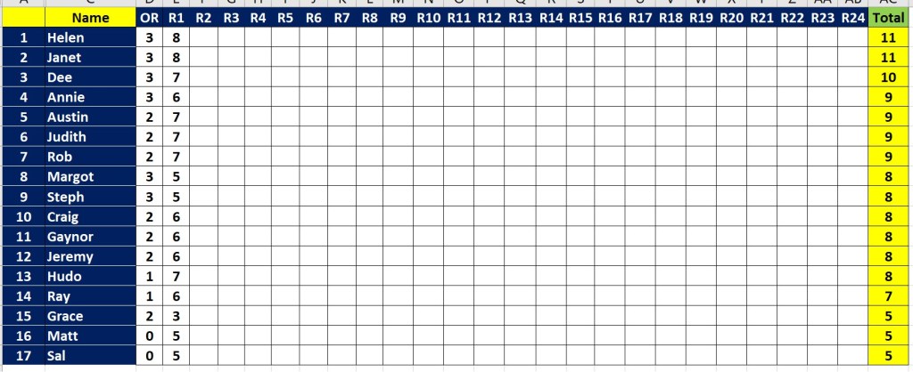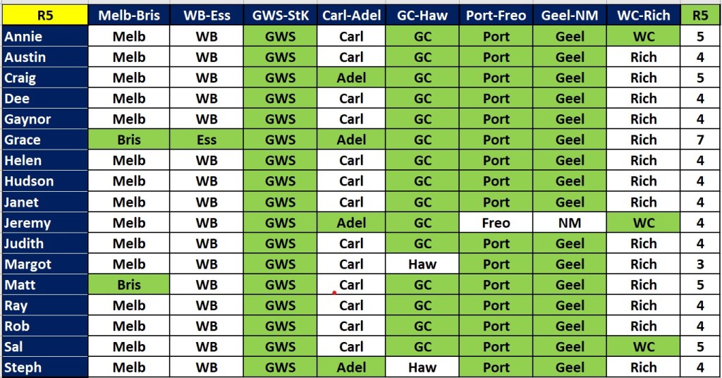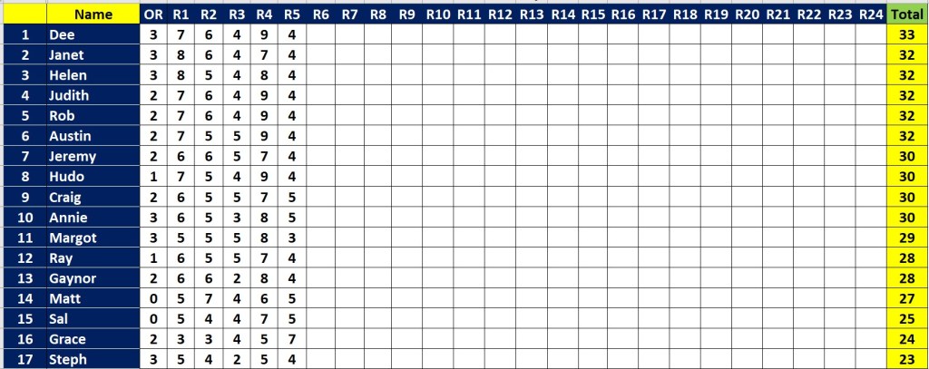 Wow – amazing Grace! She tipped 7 out of 8! The next best was 5 by Annie, Matt, Sal and me. Way to go Grace. At the top of the ladder there’s no change. It’s still Dee by 1.